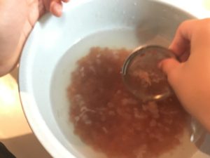 - ボールに塩水(500ccに塩大さじ1くらい)をいれ、いくらを戻してかき混ぜ、浮いてきた皮などを茶こしを使って取り除く