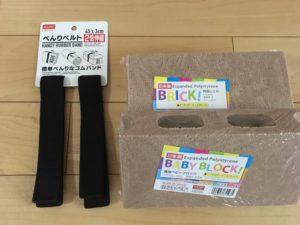 庶民の味方、DAISOさんで揃えることができました。全部で324円税込です。レンガ(ブロック)の大きさもペダルにピッタリで全く切る必要がなく助かりました。特に理由はないですが、今回はブロックタイプとレンガタイプの発泡を買ってみました。