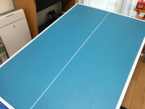 天板をダイニングのテーブルへ置き、支柱とネットを取り付けて見事完成です。若干、反りが気になりますが、思った以上の完成度で大満足です。この反りは両端が重いため下がってしまい、中央部分(連結部分)がどうしても盛り上がってしまうからだと思います。何か支えがあれば解消しそうです。