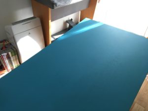 ヤスリがけに熱中してしまい、途中の写真を取るのを忘れてしまいました。120番->240番の順番でしっかりヤスリをかけます。ここをしっかり時間を掛けてヤスリがけすると天板がツルッとなるはずです。私は、途中で断念し結構荒い感じになりました。