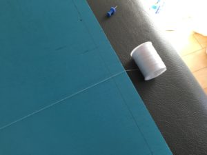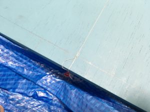 ・センターラインを糸と画鋲を使って3mm幅で線を引きます。これは、定規が短くてセンターラインをまっすぐ引くことができなかったための苦肉の策です。3mmは測るのも大変だったので、マスキングは目分量でやりました。